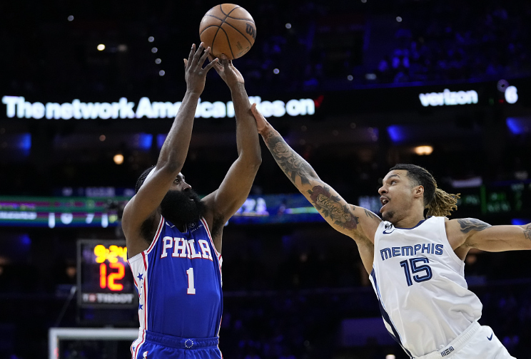吉祥坊费城 76 人队的詹姆斯哈登在对阵孟菲斯灰熊队的比赛中投篮