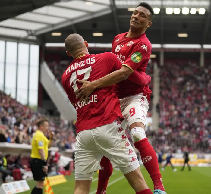 美因茨的 Ludovic Ajorque 在德甲对阵拜仁慕尼黑的比赛中进球后庆祝