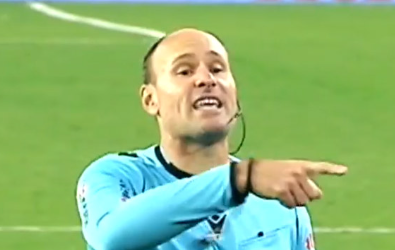 在诺坎普的比赛中,西班牙裁判 Mateu Lahoz 与巴塞罗那的西班牙中场 Gavi 交谈。